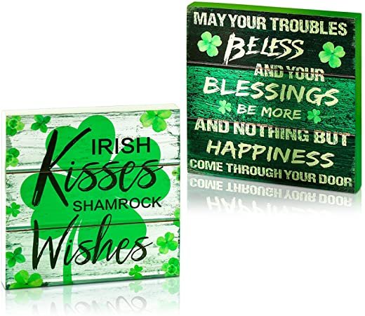 2 Pieces St. Patrick’s Day Wood Decors Wood Box Signs Irish Rustic Tabletop Decor Wood Block Plaque May Your Blessings Irish Kisses Shamrock Wishes for St. Patrick Home Table Decorations, 8 x 8 Inch