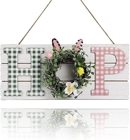 Easter Wall Hanging Decoration, Hop Easter Wooden Decoration with Eucalyptus Wreath for Holiday Indoor and Outdoor Porch Wall Home Office Farmhouse Bunny Decorations Easter Gift for Family Friends