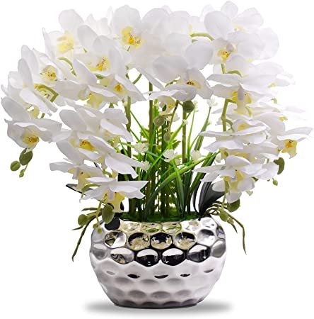 Faux Orchid Artificial Flowers with Silver Ceramic Vase, Artificial Plants for Home Table Decor Indoor