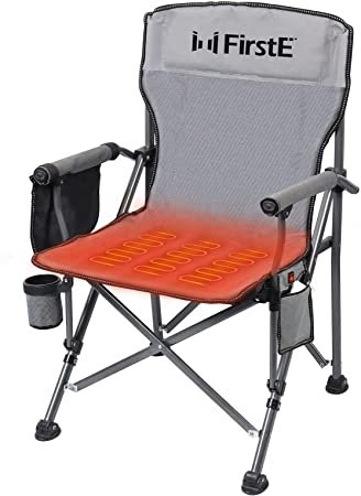 FirstE Heated Camping Chair – Heavy Duty Portable Folding Heated Chair Outdoor for Sports, Beach, Picnic. Padded USB Heated Lawn Chair with Armrest, Cup Holder, Pockets (Battery Pack NOT Included)