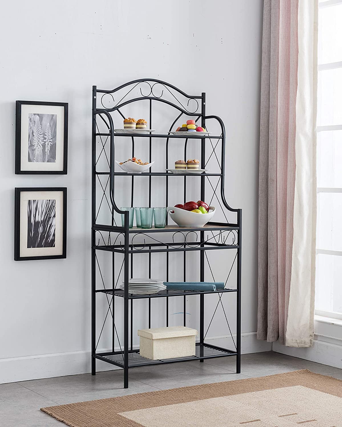 • Whether you need more storage space in your kitchen or need a spot to display decor in the den, this lovely baker’s rack is the perfect pick.