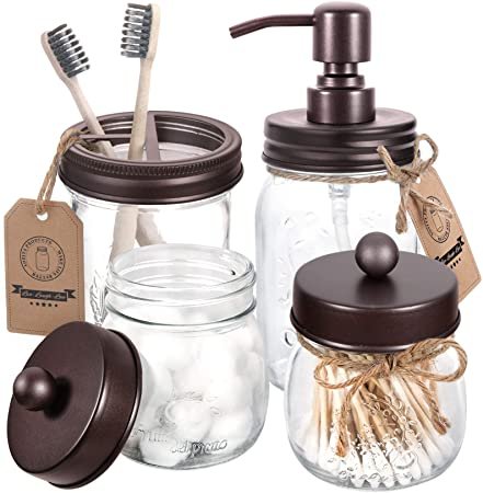 Mason Jar Bathroom Accessories Set 4 – Bronze – Mason Jar Soap Dispenser & 2 Apothecary Jars & Toothbrush Holder – Rustic Farmhouse Restroom, Bathroom Home Decor Clearance, Countertop Vanity Organizer