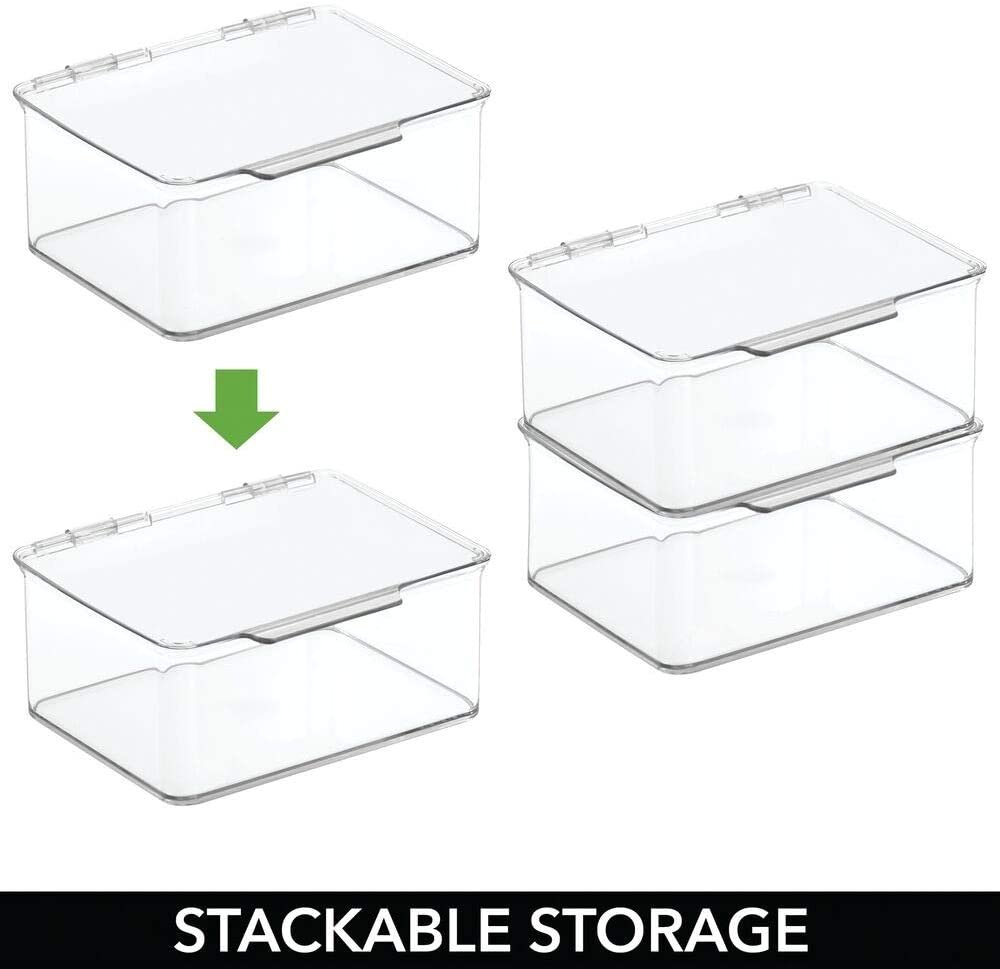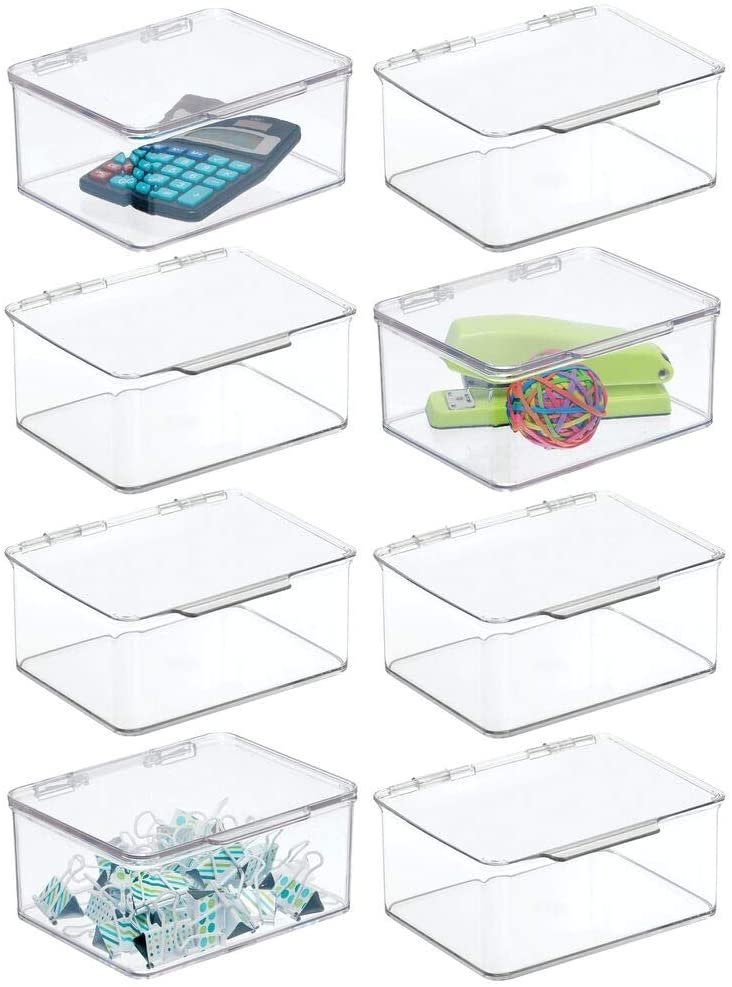 - STACK & STORE: Hinged lid keeps contents contained in each rectangular organizer; Protect your items from dust and debris; The clear construction makes it easy to see what’s inside without opening each box; Create space-saving, vertical storage in file cabinets, desk drawers, shelves and closets; Maximize your storage space in multiple rooms throughout your home; mDESIGN TIP – we love these bins for storing small toys such as building bricks, doll clothes and accessories, action figures and more
