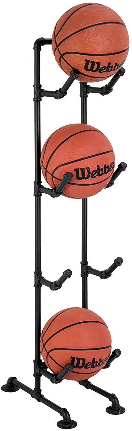 MyGift 4-Tier Rustic Industrial Black Metal Pipe Indoor/Outdoor Basketball, Volleyball, and Sports Ball Storage Organizer Rack