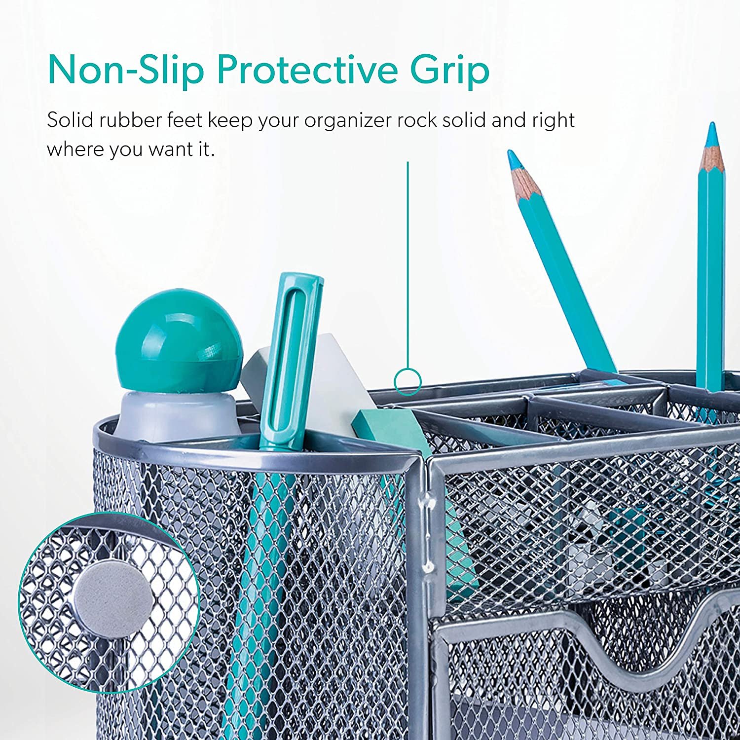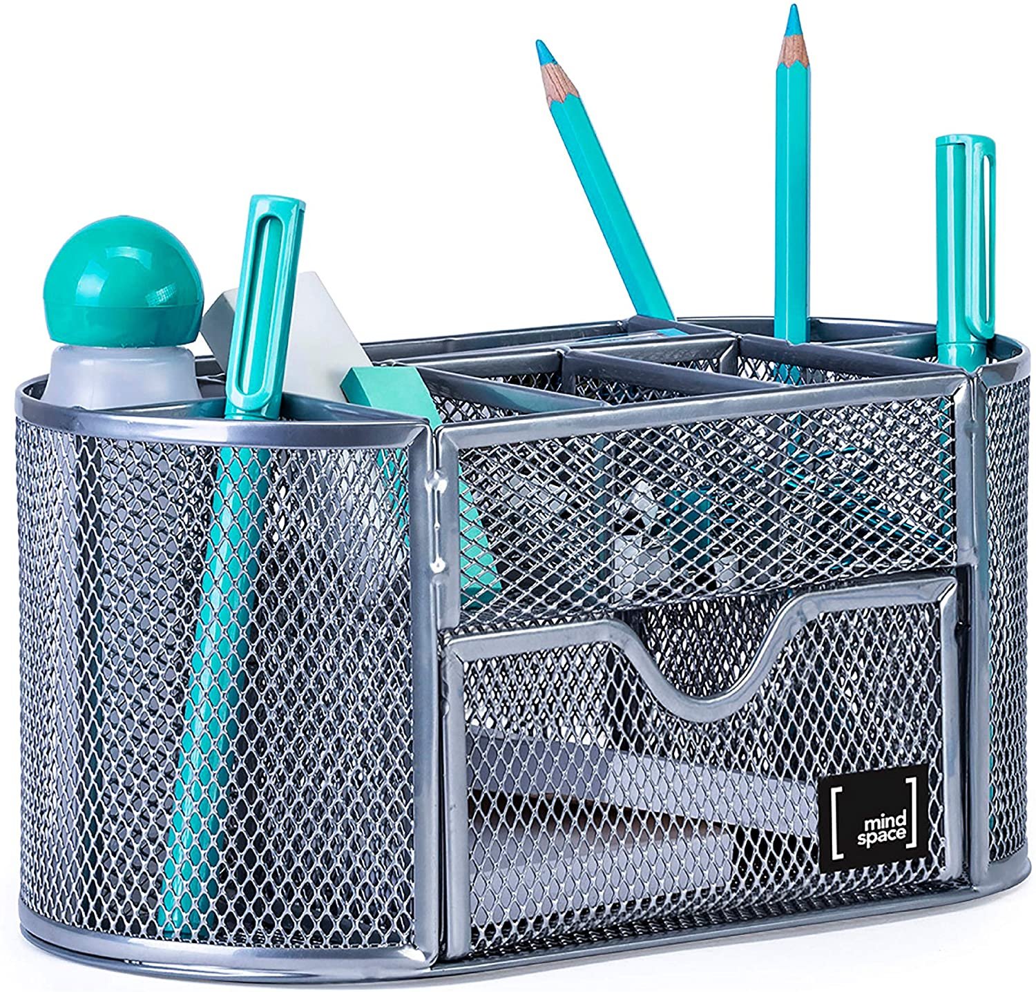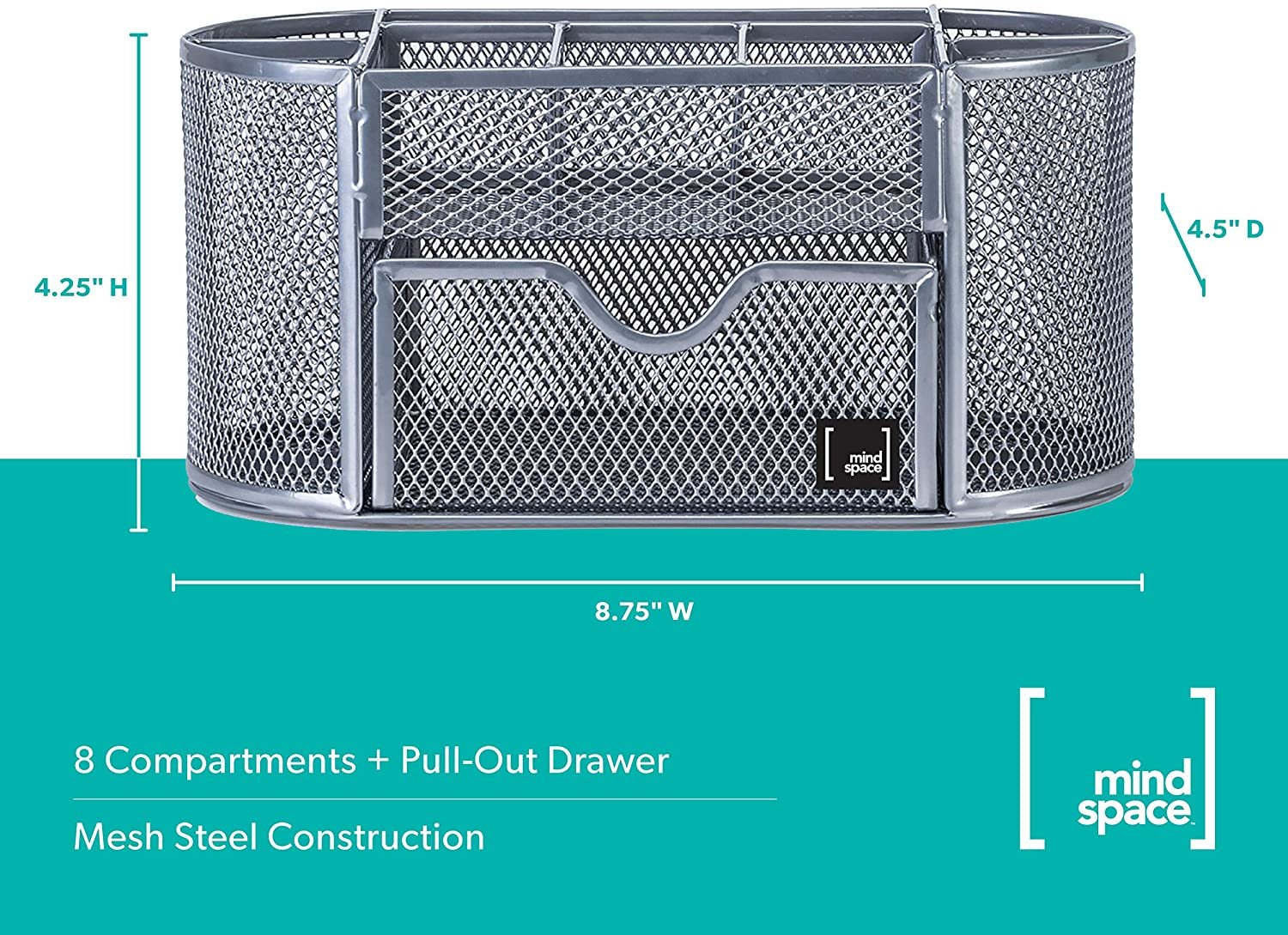 • ▶ SPACE SAVING MESH DESIGN. Desktop organizer with 8 silver compartments plus drawer for better organization of your office supplies, pencils, sticky notes. No more messy desks and cluttered office spaces.