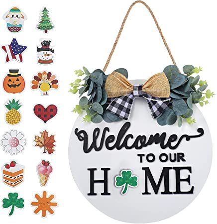 Seasonal Interchangeable Welcome Sign for Front Door Decor, Welcome to Our Home Sign with Interchangeable Holiday Pieces, Welcome Door Sign for Farmhouse Front Porch Decor and Housewarming Gift(White)