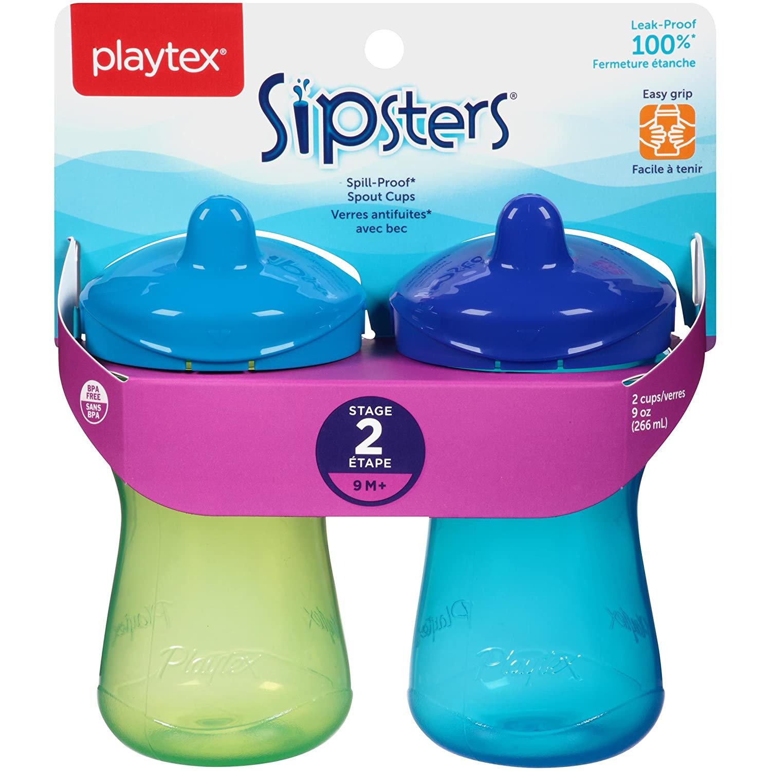 Playtex Sipsters Stage 2 Spill-Proof, Leak-Proof, Break-Proof Spout Sippy Cups – 9 Ounce – 2 Count (Color May Vary)