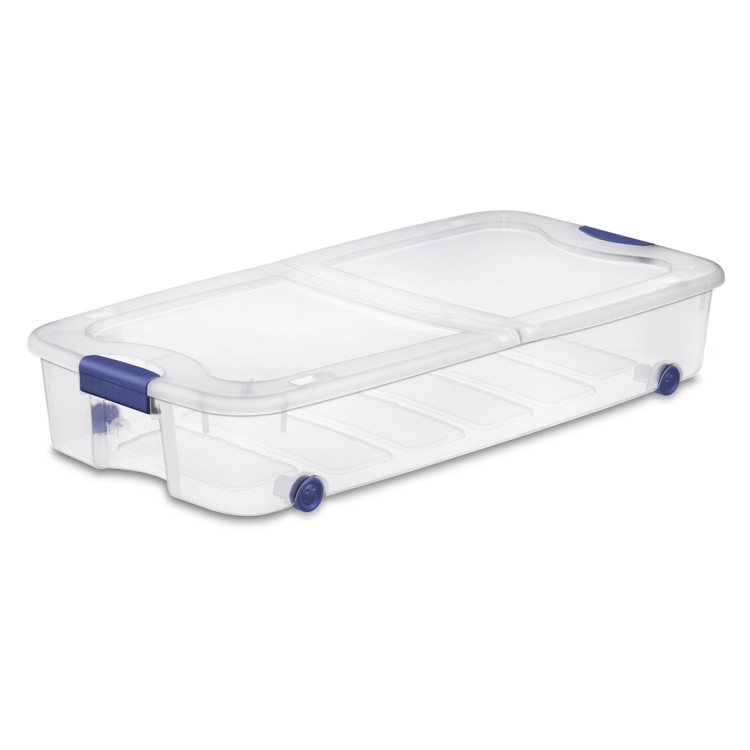 The 62 L Ultra™ Wheeled Underbed Storage Box features durable latches that attach the lid securely to the base to ensure that contents remain secure when stored. The see-through base allows contents to be easily identified, and multiple bases are able to stack on top of each other. The smooth gliding wheels allow this latch storage box to easily slide out from storage under a bed, and the hinged lid provides quick and easy access to the contents.