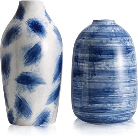 TERESA’S COLLECTIONS Oriental Blue and White Ceramic Vase Set of 2, Decorative Glazed Vases for Home Decor, Living Room, Mantel, Table Decoration, 7.2″ & 8.7″ Tall